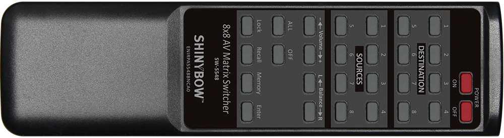 The SB-5548BNC is a true matrix routing switcher for AV (Composite & Stereo Audio) signals. Full support for NTSC or PAL Composite Video & Stereo Audio TV systems. The SB-5548BNC has (8) individual Composite Video (BNC connector) and Stereo Audio inputs with (8) individual Composite Video (BNC connector) and Stereo Audio outputs. Audio outputs control and adjust volume and AR/AL balance. Because it is a matrix router, any input may be routed to any output; or the same input may be routed to all outputs or any combination. It completely eliminates the need to constantly move around video audio input and output cables. The switcher is useful for matrix signals from composite video and stereo audio source devices (such as: VCRs, Camcorders, Video Game Consoles, Video CDs, DVDs, Satellite Receivers, CAT5 Set Top Boxes, etc.) to composite video/audio destination devices (such as: LCD TV, HDTV, Plasma displays, Projectors, etc.). Selection of inputs can be made via the front panel push buttons or an infrared remote control or RS-232 control with a computer. A RS-232 Windows GUI interface is provided for matrix routing control (Windows only).